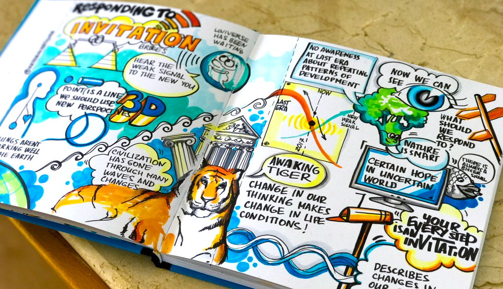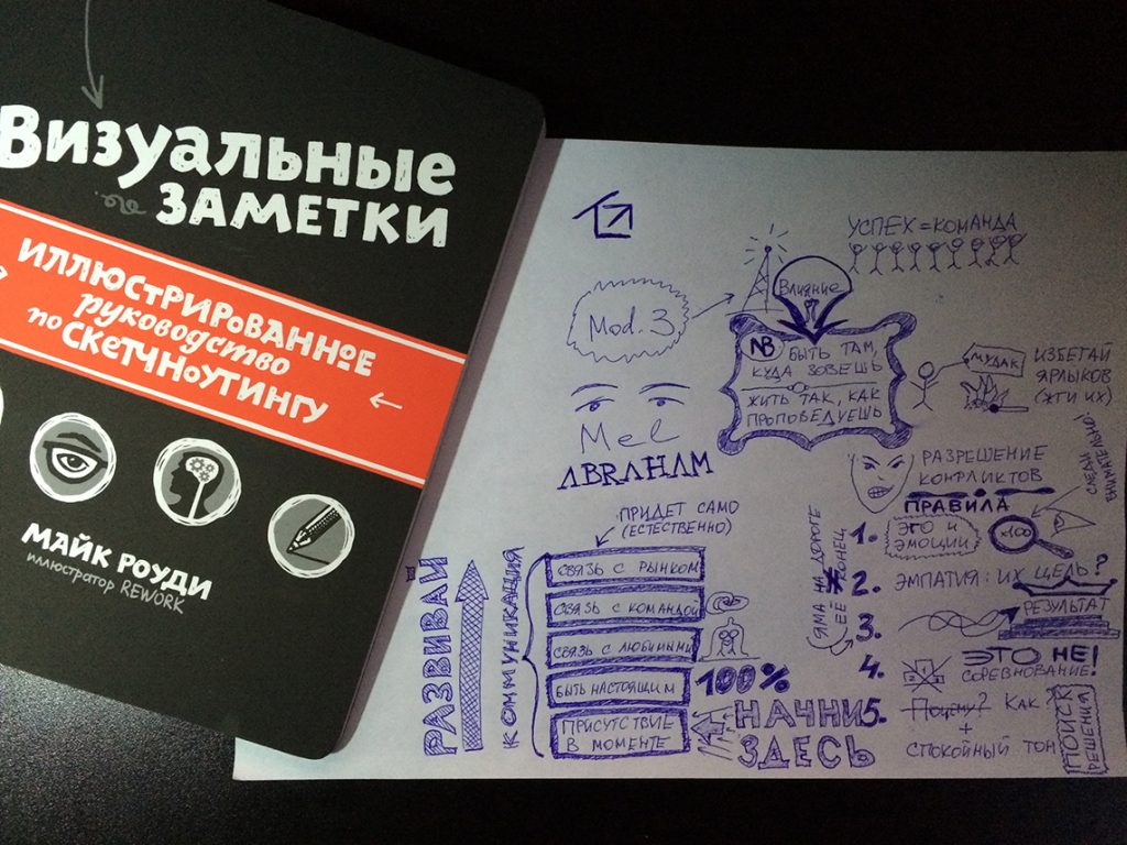 Еще одним вариантом развития вашего навыка визуальных заметок является скрайбинг на мероприятиях и визуальное сопровождение. Скетчноутинг прекрасно масштабируется, и то что вы рисуете у себя в блокноте, может быть нарисована на флипчарте перед аудиторией.