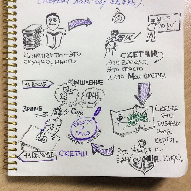 Скетчи — это визуальные заметки, состоящие из текста, рисунков, схем, стрелок, рамок и линий.