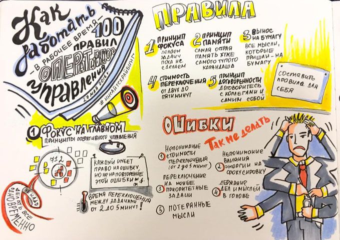 Для того чтобы начать практиковать скетчноутинг, нужно понять и прочувствовать самое главное правило — вы рисуете не для красоты, а для решения ваших задач! Большинство людей трезво оценивают свои изобразительные способности, но это не тот случай — вам не нужно уметь рисовать для ведения визуальных конспектов, фактически будет достаточно чтобы вы сами смогли угадать что нарисовали.