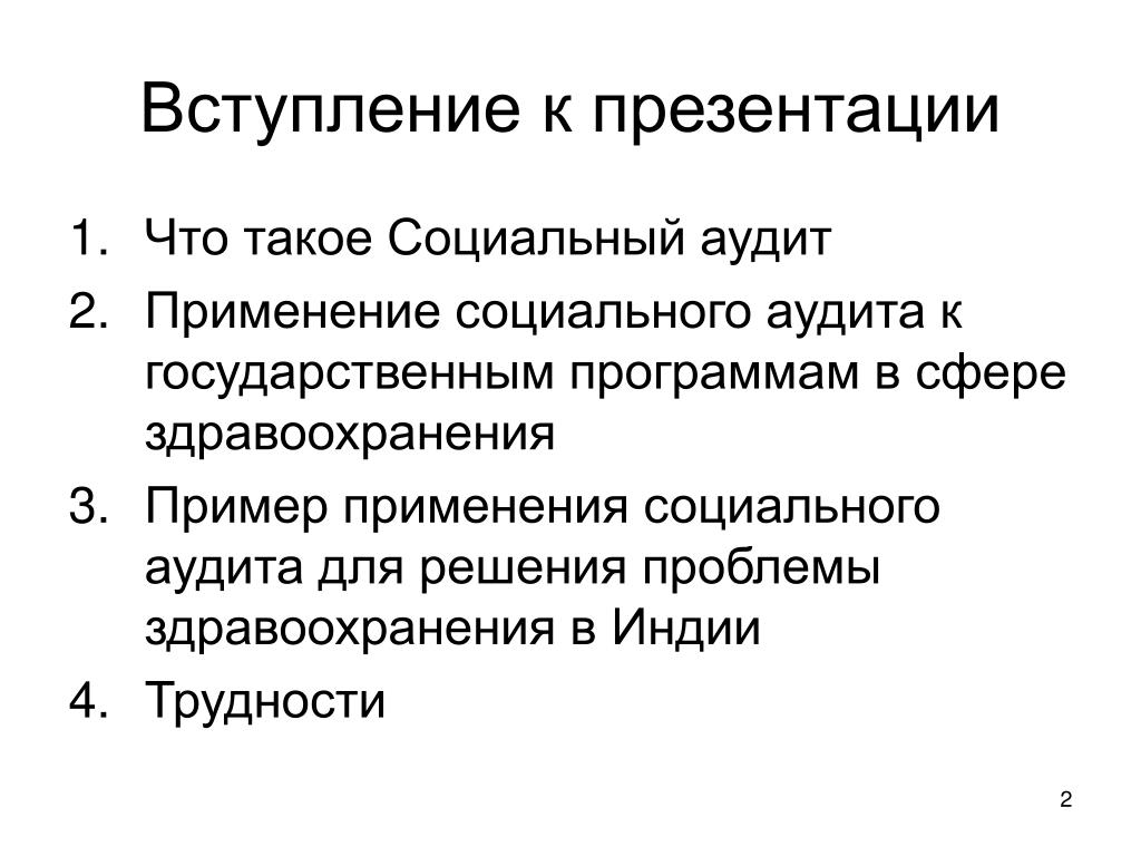 - Вступление. Должно быть коротким, на 1-2 слайдах. Цель — просто ввести слушателей в курс дел и помочь быстрее сориентироваться в последующей информации.