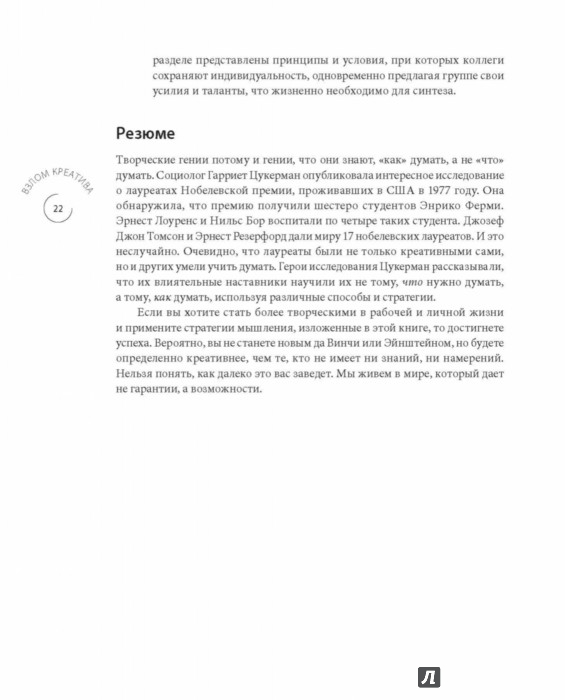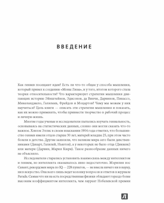 Как гениев посещают идеи? Есть ли что-то общее у способа мышления, который привел к созданию «Моны Лизы», и у того, итогом которого стала теория относительности? Что характеризует стратегии мышления двигающих историю Эйнштейнов, Эдисонов, да Винчи, Дарвинов, Пикассо, Микеланджело, Галилеев, Фрейдов и Моцартов? Чему мы можем у них научиться? Цель книги — описать эти стратегии мышления и показать, как их можно применять, чтобы привнести творчество в рабочий процесс и личную жизнь.