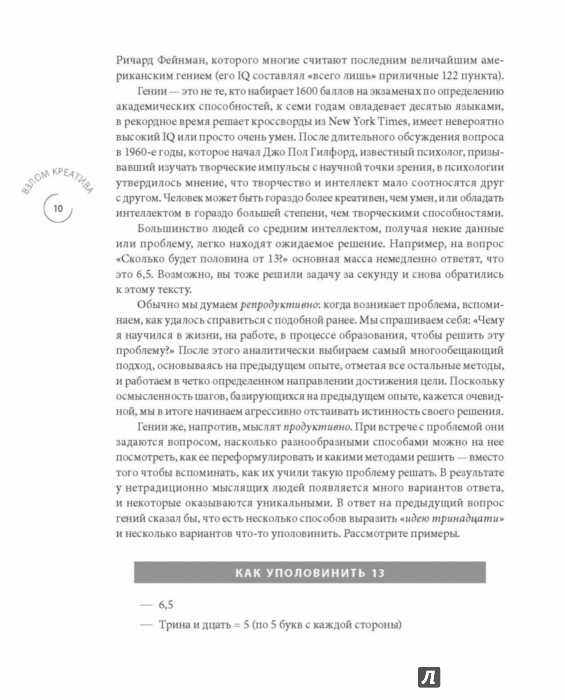 Гении же, напротив, мыслят продуктивно. При встрече с проблемой они задаются вопросом, насколько разнообразными способами можно на нее посмотреть, как ее переформулировать и какими методами решить — вместо того чтобы вспоминать, как их учили такую проблему решать. В результате у нетрадиционно мыслящих людей появляется много вариантов ответа, и некоторые оказываются уникальными. В ответ на предыдущий вопрос гений сказал бы, что есть несколько способов выразить «идею тринадцати» и несколько вариантов что-то уполовинить. Рассмотрите примеры.