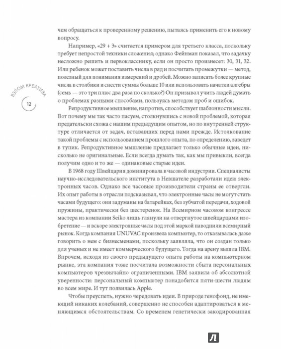 Репродуктивное мышление, напротив, способствует шаблонности мысли. Вот почему мы так часто пасуем, столкнувшись с новой проблемой, которая предательски схожа с нашим предыдущим опытом, но по внутренней структуре отличается от задач, встававших перед нами прежде. Истолкование такой проблемы с использованием прошлого опыта, по определению, заведет в тупик. Репродуктивное мышление предлагает только обычные идеи, нисколько не оригинальные. Если всегда думать так, как мы привыкли, всегда получим одно и то же — одинаковые старые идеи.