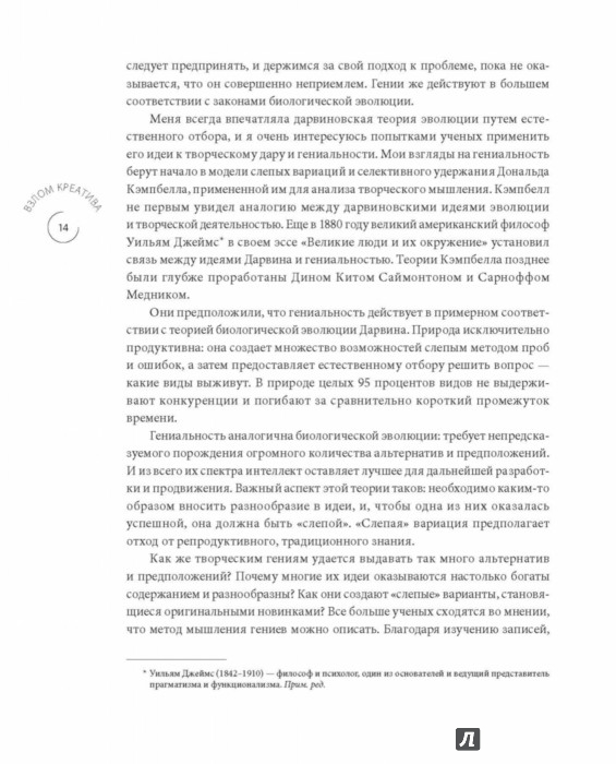 Кэмпбелл не первым увидел аналогию между дарвиновскими идеями эволюции и творческой деятельностью. Еще в 1880 году великий американский философ Уильям Джеймс1 в своем эссе «Великие люди и их окружение» установил связь между идеями Дарвина и гениальностью. Теории Кэмпбелла позднее были глубже проработаны Дином Китом Саймонтоном и Сарноффом Медником.