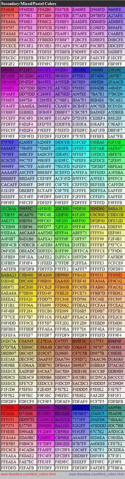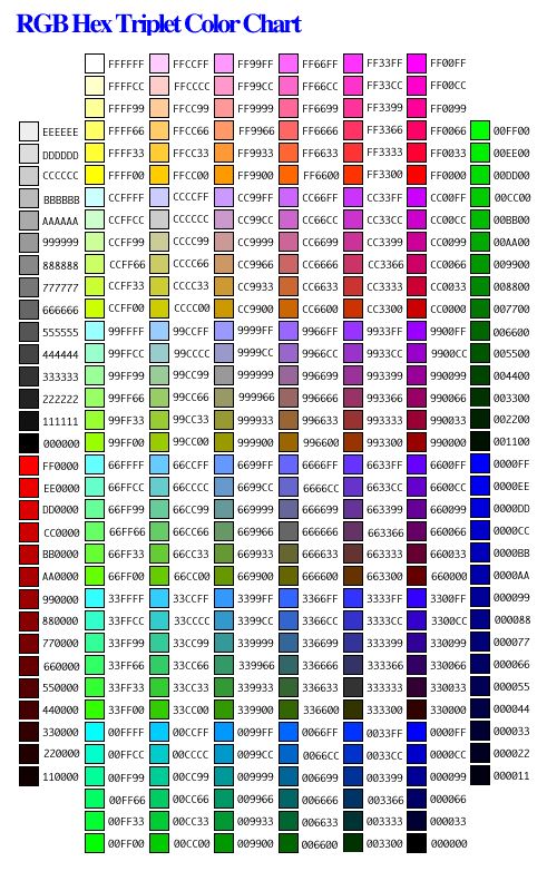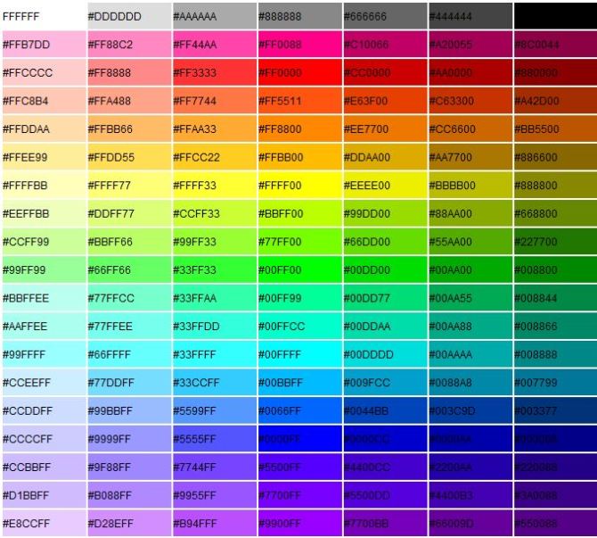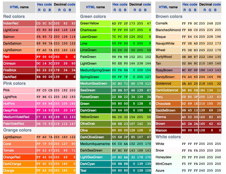 Следующая таблица содержит шестнадцатеричные коды цветов RGB, используемые различными тегами HTML (язык гипертекстовой разметки) и атрибутами CSS (каскадная таблица стилей) для указания значений цвета.