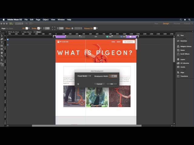 Я бы сказал, что если вам нужен определенный дизайн, вам подойдет Adobe Muse. Он очень гибкий для дизайнера. Это позволяет размещать изображения и текст именно там, где вы хотите. Он также допускает два варианта при проектировании. Гибкая ширина / дизайн с фиксированной точкой останова или «альтернативные» макеты для настольных компьютеров, планшетов и мобильных устройств (вот обзор точек останова от W3schools). Лично я предпочитаю использовать комбинацию гибких и фиксированных точек останова по ширине. Что действительно здорово, так это то, что вы можете полностью изменить весь контент / макет в зависимости от ширины браузера, это позволяет скрывать или отображать виджеты и т.