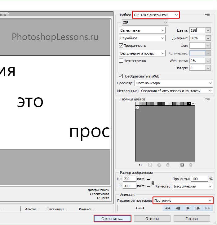 В налаштуваннях вибираємо GIF і в параметрах повторів виставляємо «Постійно».