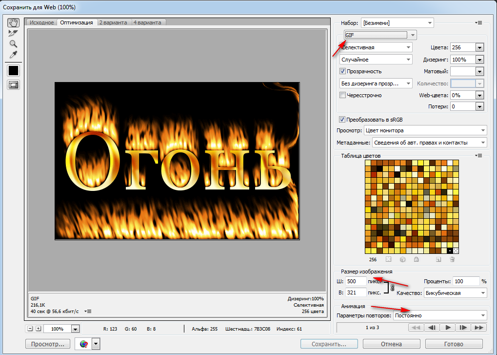 Оптимизируйте и сохраните анимацию