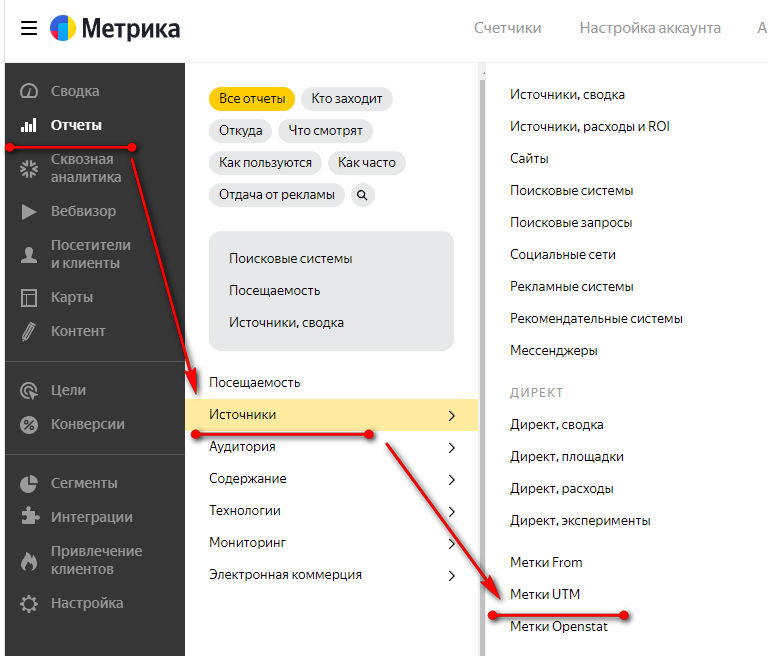 Смотреть отчет по меткам можно в Яндекс Метрике — Источник — UTM Метки.