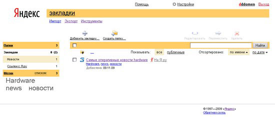Закладки. Данный сервиса имеет схожий и Яндекс.Почтой интерфейс, что делает его использование привычным и легким. Все закладки можно распределить по папкам, а также присваивать им метки. Также здесь реализованы дополнительные опции: поиск закладок, экспорт и импорт закладок, сортировка закладок, проверка закладок на их работоспособность. Однако стоит помнить, что при добавлении закладки, она автоматически публикуются в блоге на Яндексе (если его нет, то он автоматически создаётся). Чтобы этого избежать, необходимо настроить приватность и сделать ее видимой только для себя. Официальный сайт сервиса Яндекс.Закладки — http://zakladki.yandex.ru/
