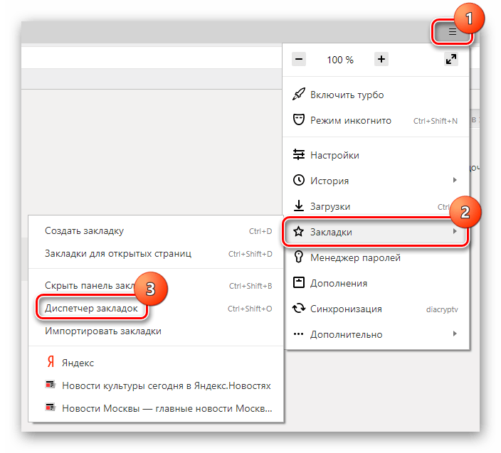 1.2. Ищем строчку — закладки, в новом окне — менеджер закладок.