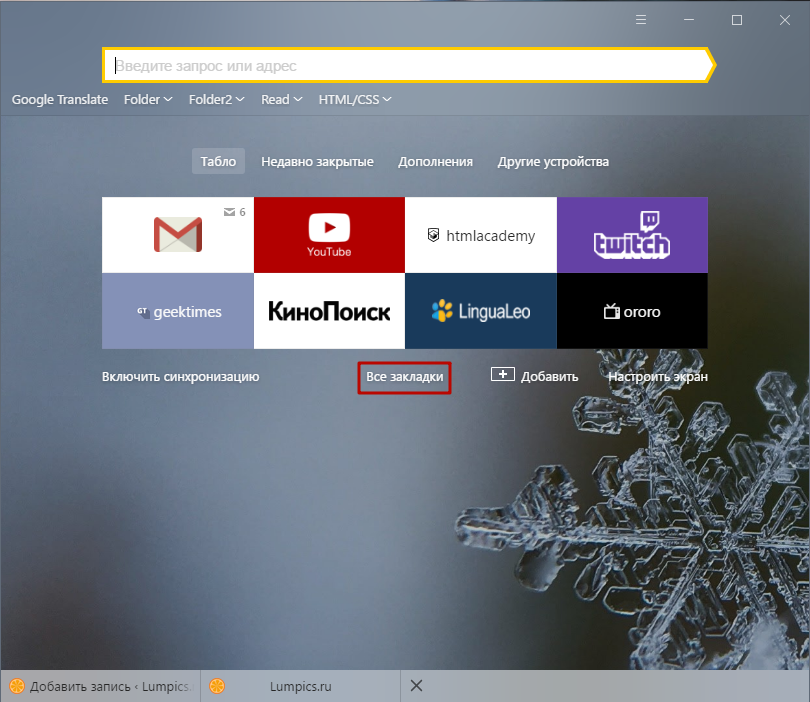 - Закрываем все вкладки браузера, кроме окна «Закладки».