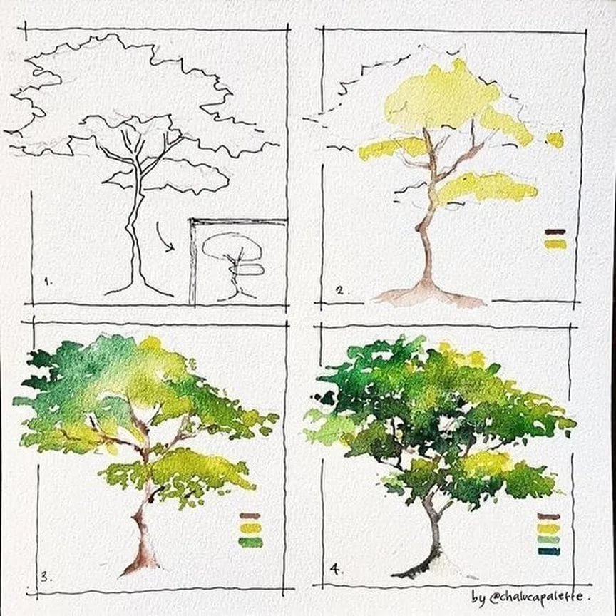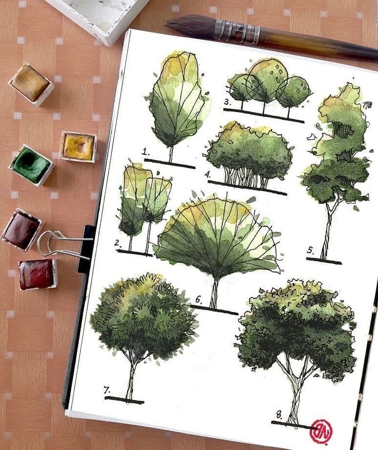 Лично мне нравится рисовать деревья в небрежном стиле акварели, а затем добавлять сверху несколько небрежных чернильных линий, чтобы придать немного структуры, но все же очень небрежно.
