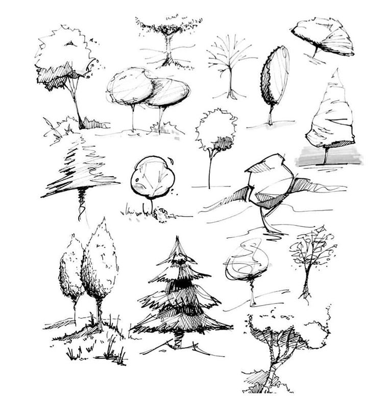 В зависимости от сценария, вашего подхода к зарисовке дерева может измениться. Если деревья присутствуют в вашем эскизе для создания атмосферы и для завершения сцены, вы можете намекнуть на них небрежно или стилизованно, особенно если их много.