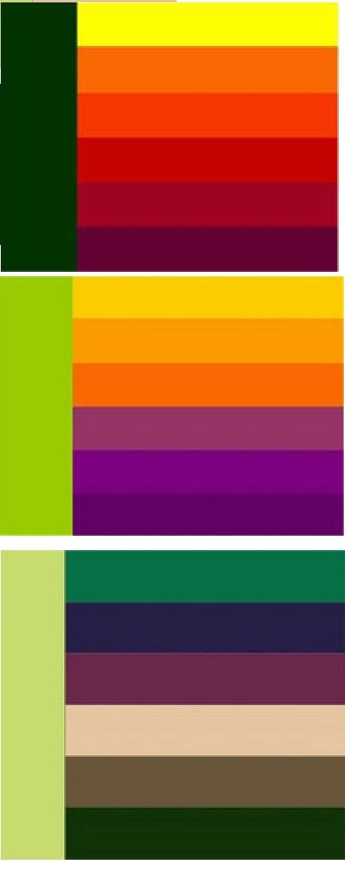 Сочетание цветов: зелено-желтый и теплый зеленый – цветовая гамма из одинаковых тонов. Такие оттенки могут быть светлее или темнее основного, так как контраст строится только на разности света. Зеленый очень многогранный оттенок и приятный глазу, поэтому такое сочетание может быть не только фоном, но и самостоятельной композицией. Таблица сочетания включает в себя фисташковый, оливково-зеленый, защитный, коричнево-зеленый, темно-зеленый.