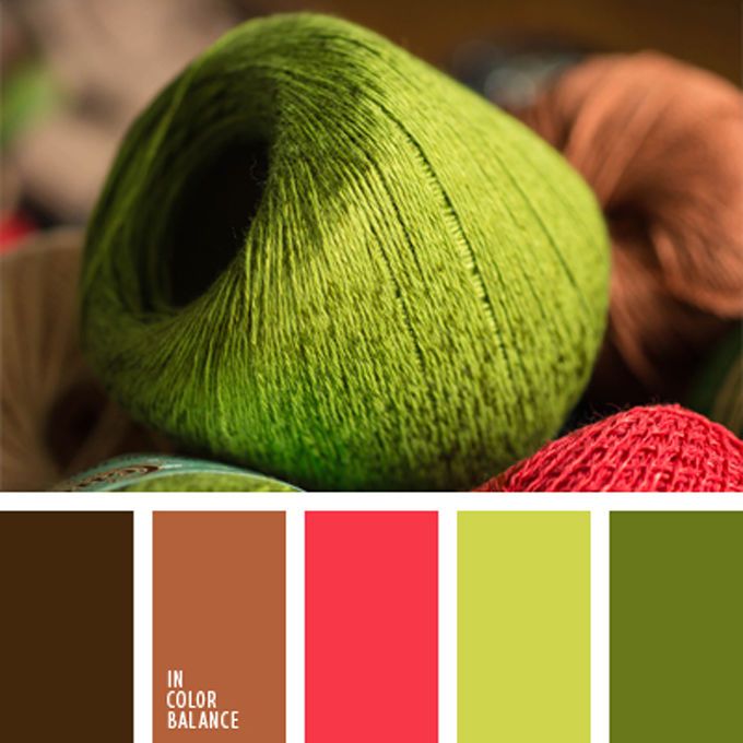 Зелено-желтый сочетается с красным по принципу дополнительного контраста — один из самых эффектных и буйных для восприятия. Чем приглушенное красные, тем спокойнее для восприятия комбинация. Палитра составлена из арбузного, кораллового красного, рубинового, кораллово-бордового, винного.
