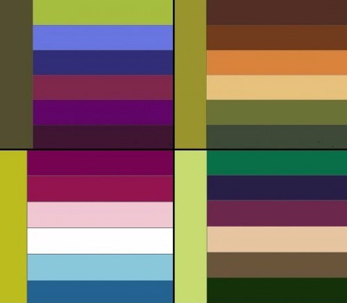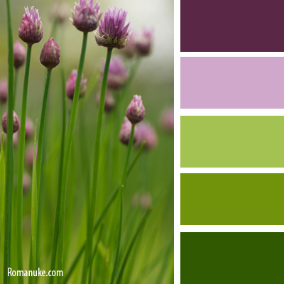 Сочетание зелено-желтого и фиолетового – сочное, броское. Оно так же берет свое начало в естественно цветочном исполнении. Композиция лучше смотрится ели поддержана световым резонансом. Таблица состоит из голубо-фиолетового, сиреневого, пурпурного, ежевичного, виноградного.