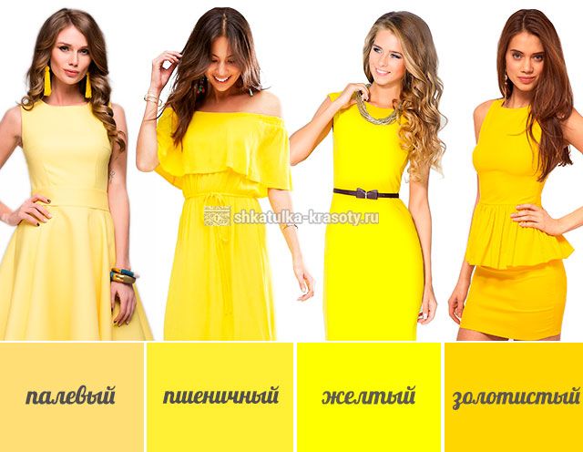 - Рассмотрим красивое желтое платье и комбинируйте его с белым, коричневым и черным или нейтральными цветами. К короткому желтому платью многие рекомендуют черные туфли. Светло-желтое платье поможет вам выглядеть моложе и здоровее.