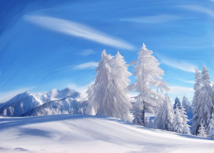 На переднем плане картины мы видим заледеневшую речку с небольшими островками мелководья. Лед имеет насыщенно-бирюзовый цвет. На берегу еле различимые темные пятнышки – это птицы сидят на небольшом кустике. Две птички сели вместе, чтобы было теплее.