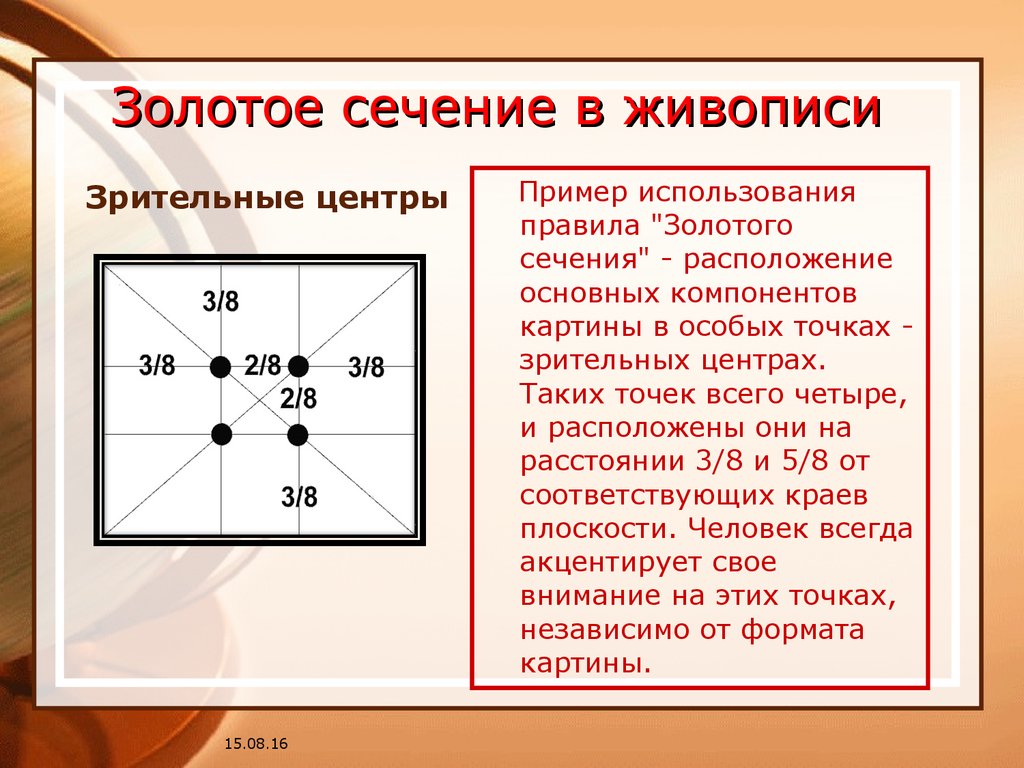И сегодня в любом искусстве пространственных форм стараются следовать пропорциям золотого сечения, так как они, по мнению искусствоведов, облегчают восприятие произведения и формируют у зрителя эстетическое ощущение.
