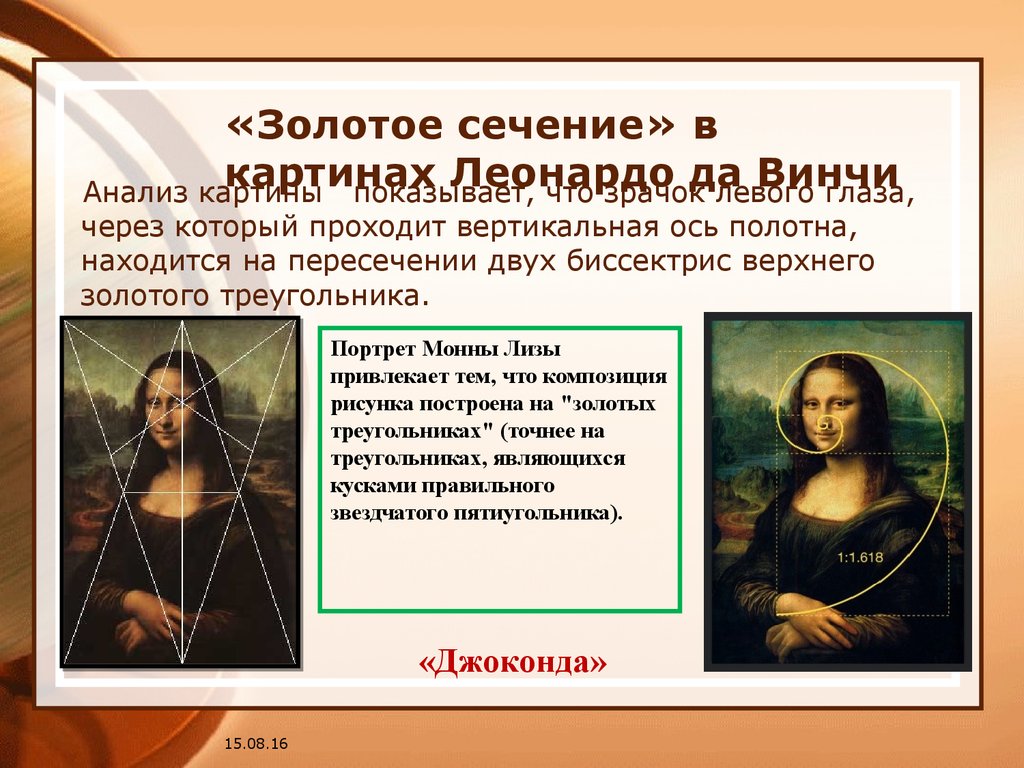 Из-за уникальных свойств она пользовалась большой популярностью. Например, в эпоху Возрождения число 1,618 было идеальным при выборе размера. Его часто применяли для создания картин и книг. А линия талии в то время считалась границей золотого сечения в теле человека.