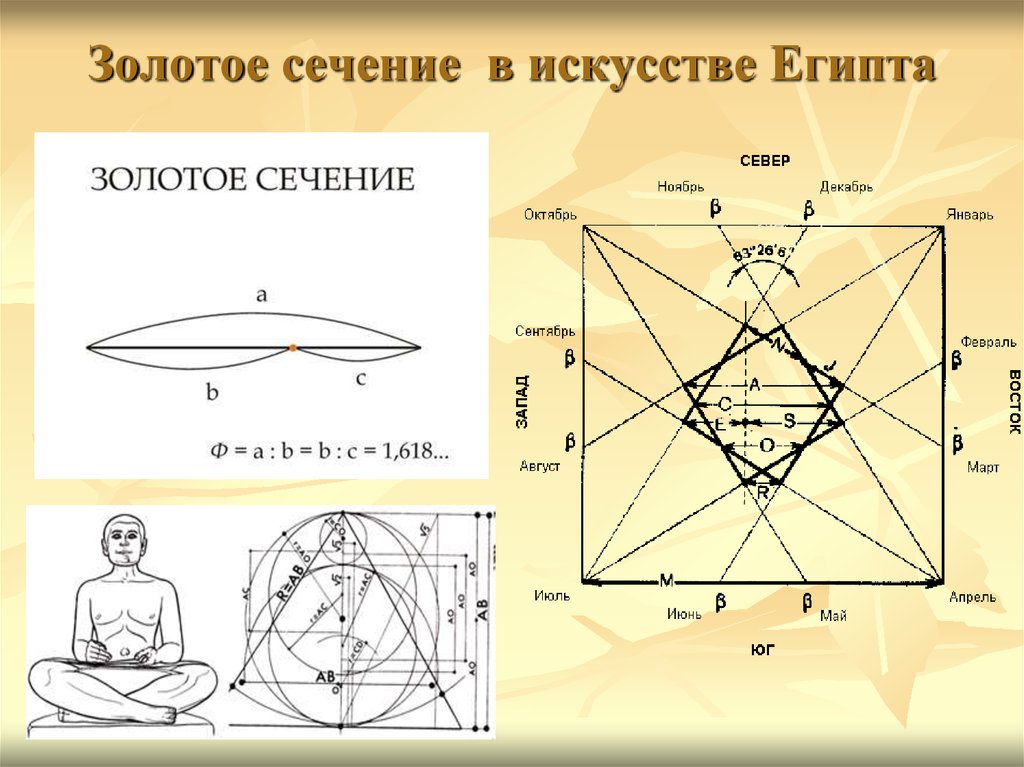 Если посмотреть на соотношение сторон пирамид, храмов и предметов домашнего обихода у древних египтян, а также на украшения из саркофага царя Тутанхамона, то очевидно, что все они создавались по принципу золотого сечения.