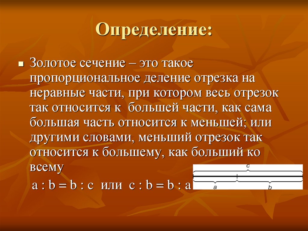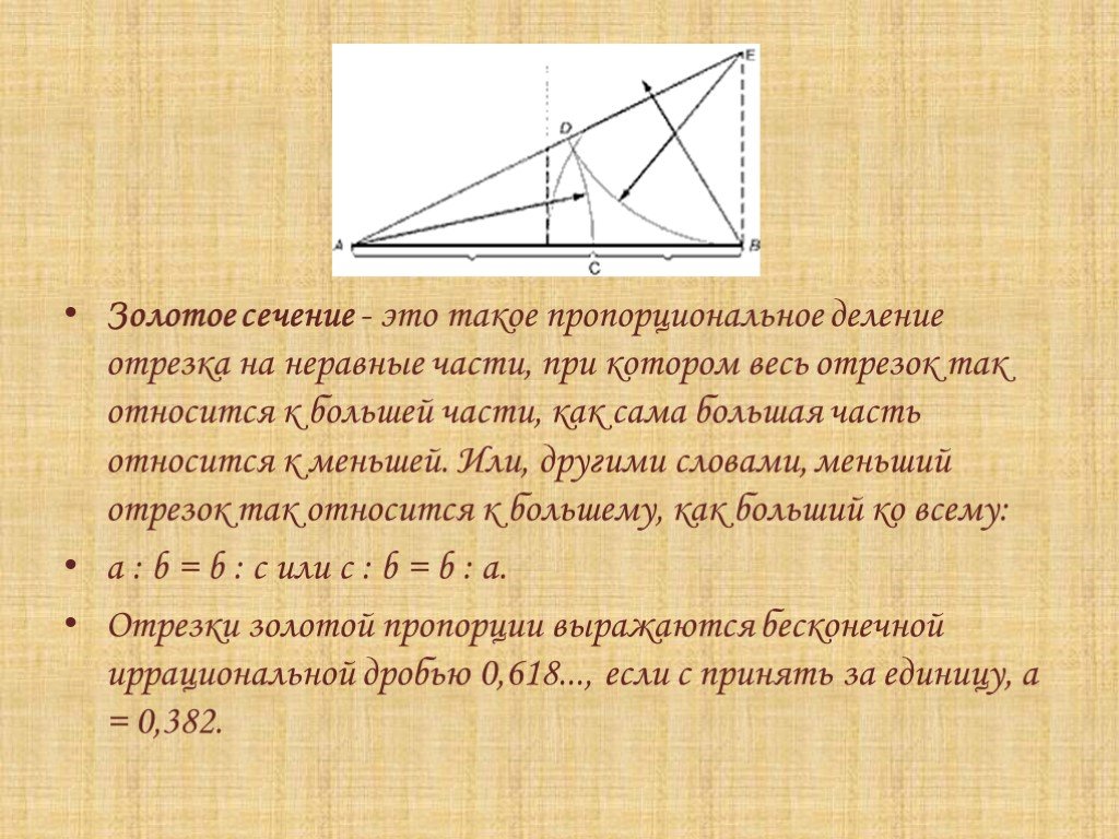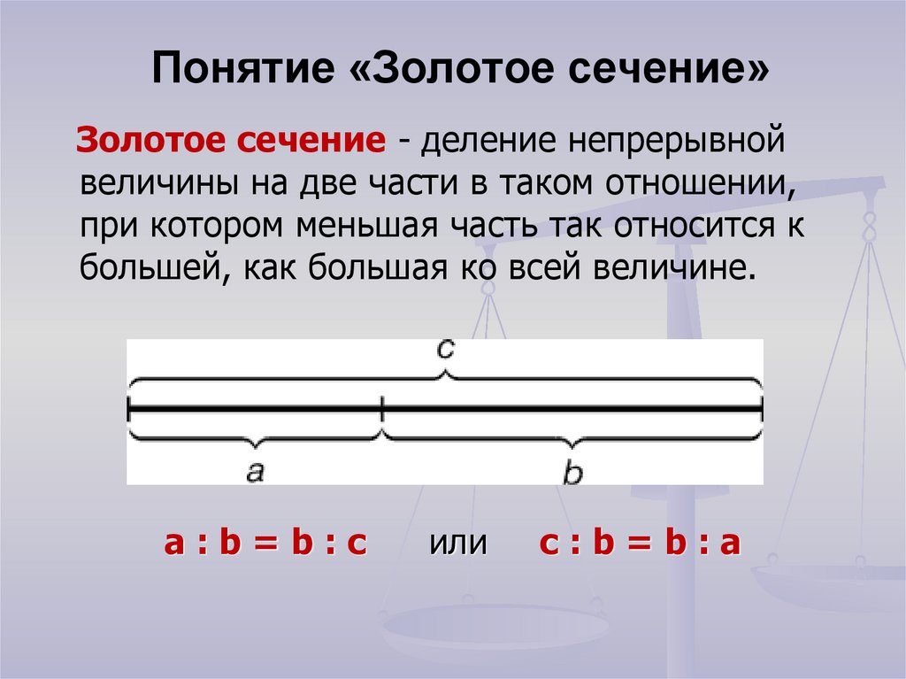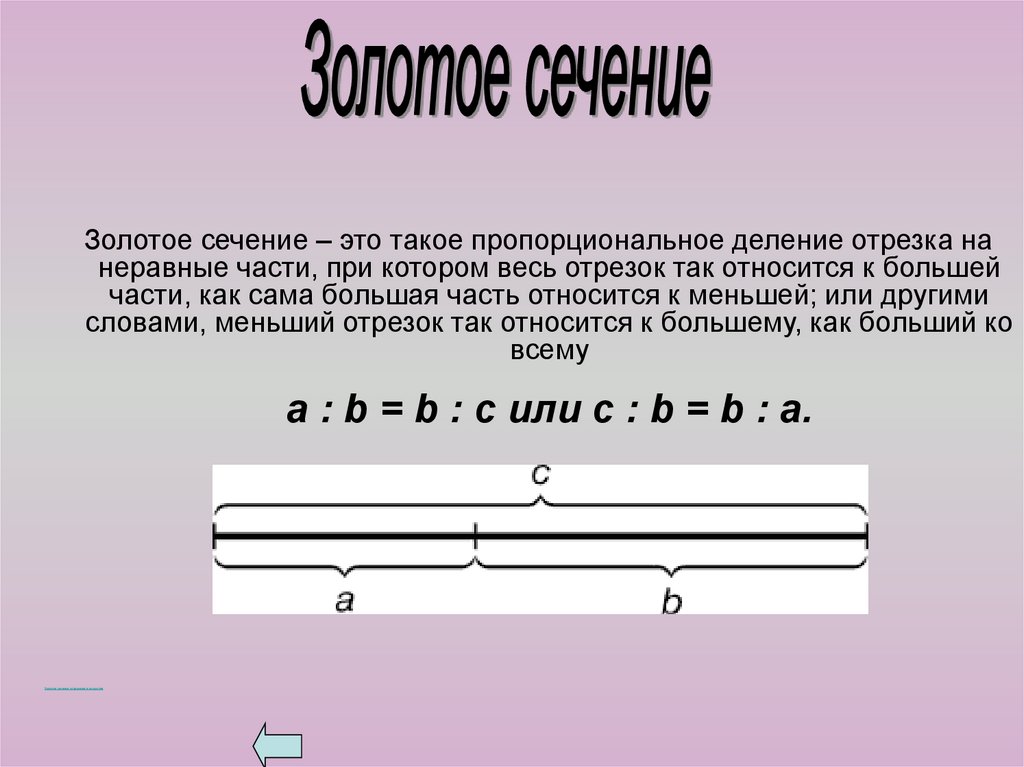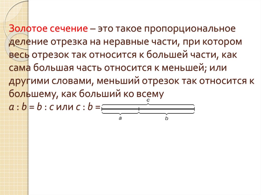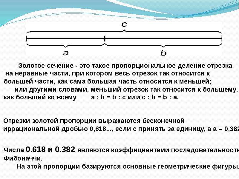 Что это? Золотое сечение – это математическая формула, соотношение двух неравных чисел.