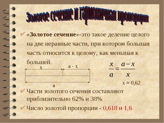 Наиболее емкое определение золотого сечения гласит, что меньшая часть относится к большей, как большая — ко всему целому. Приблизительная его величина — 1,6180339887. В округленном процентном значении пропорции частей целого будут соотноситься как 62% на 38%. Это соотношение действует в формах пространства и времени.